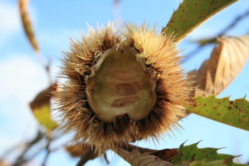 Charakteristisch für die Esskastanie ist der sehr stachelige Igel, die äußere Hülle die die eigentlich Frucht schützt du sich erst öffnet wenn die Kastanie reif ist.
